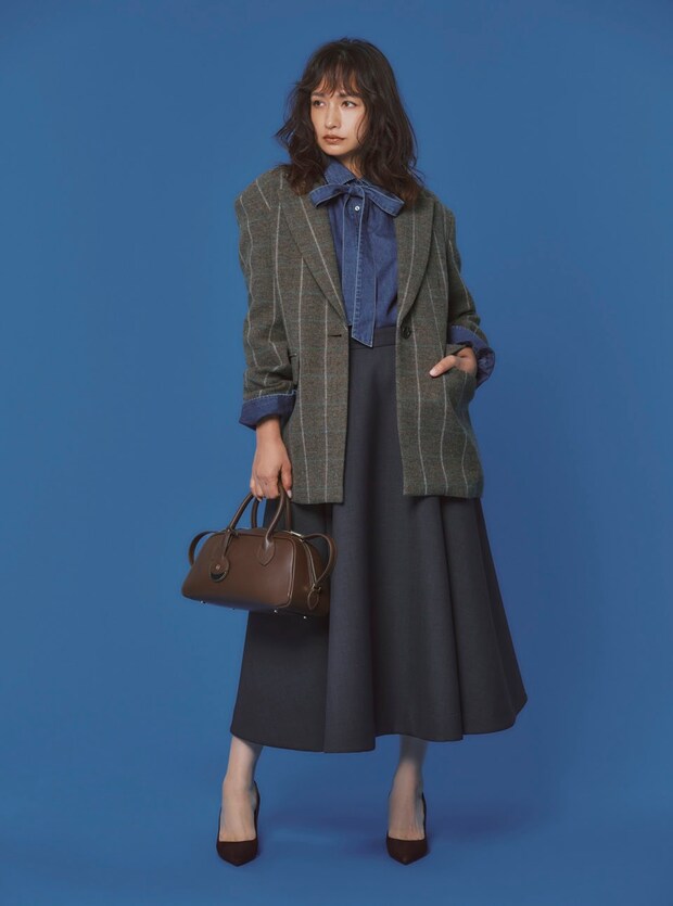 ジャケット¥53,900、スカート¥28,600(共にジャーナル スタンダード レサージュ/ジャーナル スタンダード レサージュ 銀座店)、ボウタイデニムブラウス¥64,900(ドゥロワー/ドゥロワー 青山店)、バッグ¥69,300(アトリエ トゥモローランド/トゥモローランド)、シューズ¥148,500(クリスチャン ルブタン/クリスチャン ルブタン ジャパン)