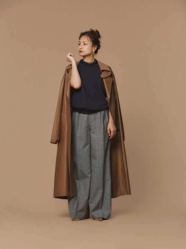 チェックパンツ¥75,900、半袖レース付きニット¥50,600(共にドゥロワー/ドゥロワー 青山店)、トレンチコート¥165,000(バウト)、シューズ¥68,200(ネブローニ)、左耳のシングルピアス¥53,900(マリア ブラック/ショールーム セッション)