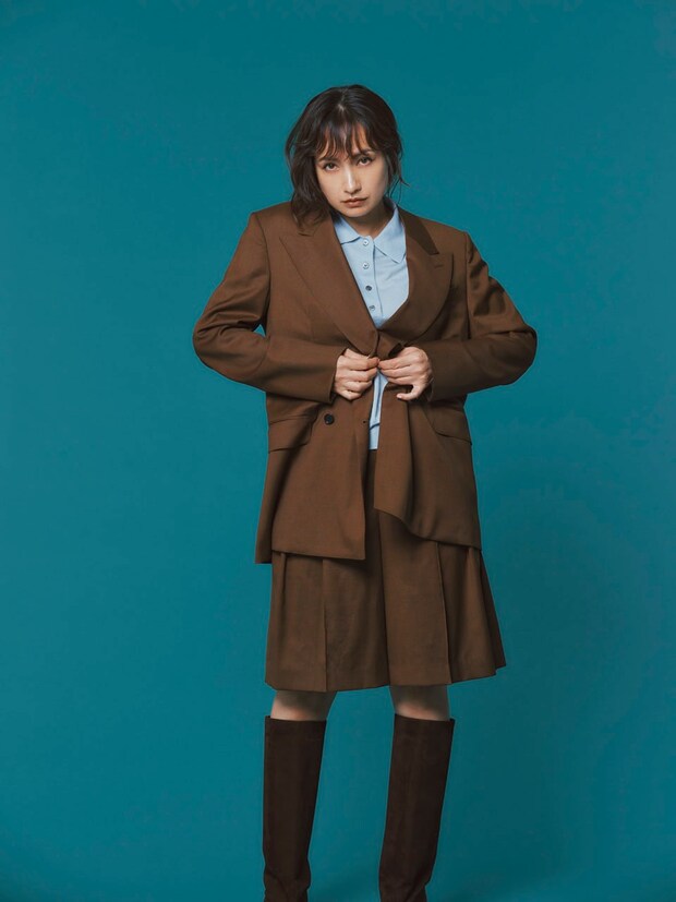 ポロニット¥47,300(デミリー/リトルリーグ インク)、ジャケット¥132,000、ショートパンツ¥63,800(共にトゥモローランド ビー/トゥモローランド 渋谷本店)、ブーツ¥110,000(ネブローニ/アルアバイル)