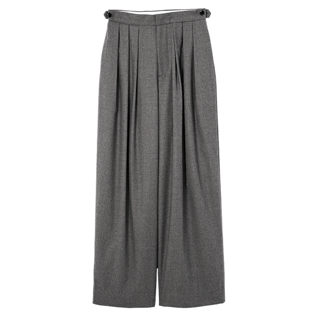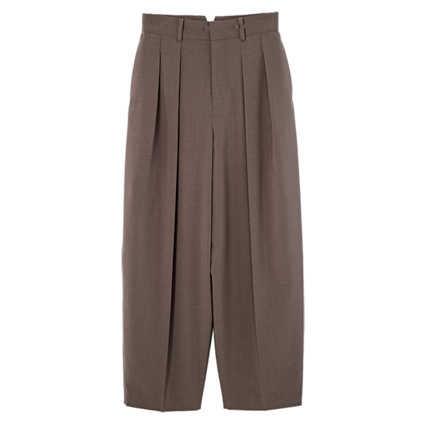 チェックパンツと同様に太めが気分ですが、今季多いダブルタックを選べば安心。ヒップまわりもカバーできる上に、こなれたムードが出せます。シューズにかぶさるくらいのやや長め丈が正解バランスです。