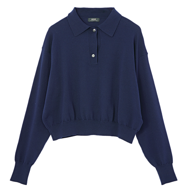 「やや短めの着丈がいい」。ネイビーポロニット¥19,250(ジャーナル スタンダード レサージュ/ジャーナル スタンダード レサージュ 銀座店)