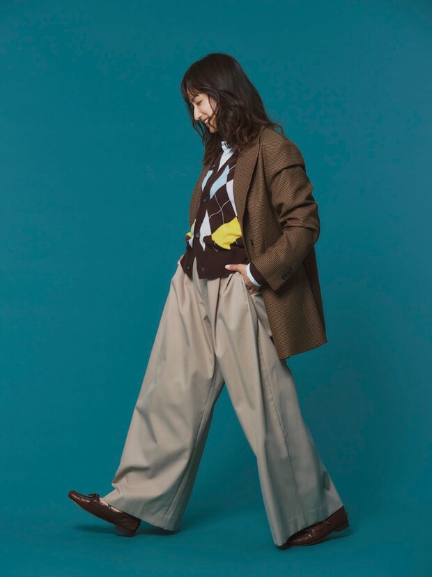 アーガイルカーディガン¥55,000(マカフィー/トゥモローランド)、ロングTシャツ¥20,900(SEA/エスストア)、ジャケット¥36,300(ザ・ポーズ/ウィム ガゼット ルミネ新宿店)、チノパンツ¥60,500(バウト)、ローファー¥81,400(ヘリュー/ショールーム セッション)