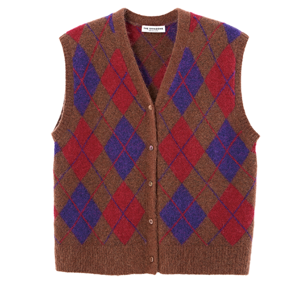 「シャツにはもちろんTシャツにレイヤードしても可愛いニットベスト。色みもおしゃれ」。アーガイルニットベスト¥31,900(ザ・シンゾーン/シンゾーン ルミネ新宿店)