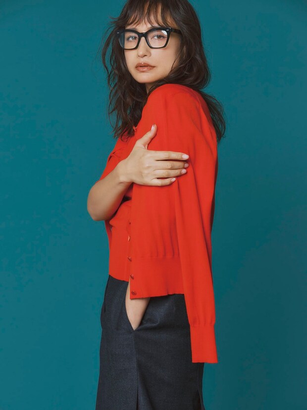 Vネック半袖ニット¥24,200、カーディガン¥26,400(共にエストネーション)、スカート¥42,900(セオリー/リンク・セオリー・ジャパン)、眼鏡¥54,780(オリバーピープルズ/ルックスオティカジャパン カスタマーサービス)