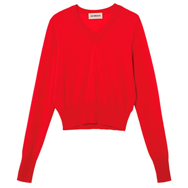 「上質なノンミュールジングウールを使用していて、肌触り最高!」。シーズンレスで着用可能。Vネックニット¥48,400(オブリオ)