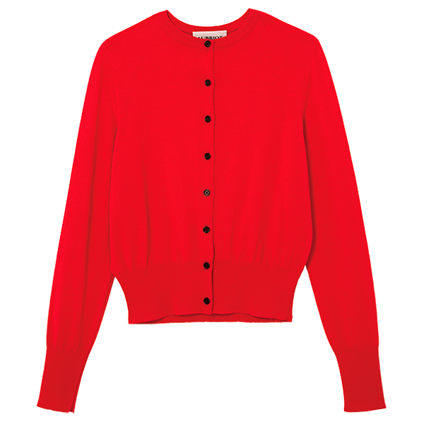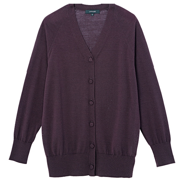 「長めのカーディガンが着やすくて、1枚あると便利」。薄手の洗えるウールシルク素材を使用。カーディガン¥28,600(アンタイトル)