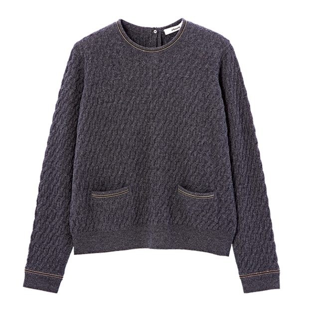 「同じデザインの半袖ニットもあって、ツインニットで着用しても可愛いですよ!」。グレーニット¥50,600(エブール/リトルリーグ インク)