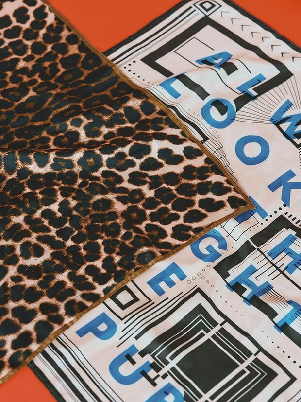 スカーフはシルク素材を。レオパード柄スカーフ¥16,500(マニプリ/アルアバイル)、ポスター柄スカーフ¥16,500(マニプリ)
