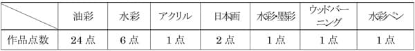 絵画の種類は油彩が24点、水彩が6点、アクリルが1点、日本画が2点、水彩・墨彩が1点、ウッドバーニグが1点、水彩ペンが1点。