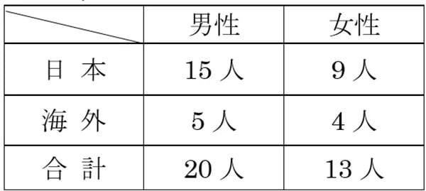 また、男性は日本15人、海外5人で合計20人、女性は日本9人、海外4人で合計13人となっている。