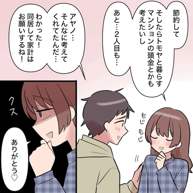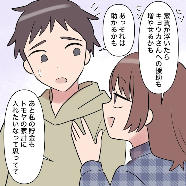 そこで私は「家賃が浮いたらキョウカさんへの援助も増やせるかも。あと私の貯金もトモヤの家計に入れたいなって思ってて」とヒソヒソ声で囁くと「あっそれは助かるかも」と初めてトモヤが同意したのです。