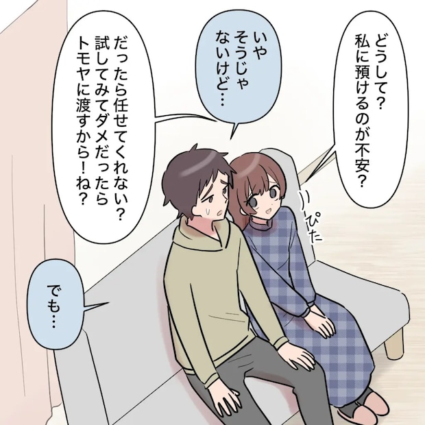 「どうして?私に預けるのが不安?」とピタッと引っ付いて詰め寄ると、「いや、そうじゃないけど・・」と言葉を濁すトモヤ。「だったら任せてくれない?試してダメだったらトモヤに渡すから!ね?」ともう一度可愛く言うと、「でも・・」とまだ難色を示している様子。