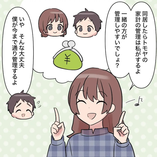 「同居したらトモヤの家計の管理は私がするよ。一緒の方が管理しやすいでしょ?」とにっこり笑顔で提案するも、「いや、そんな大丈夫。僕が今まで通り管理するよ」とトモヤにやんわり断られます。