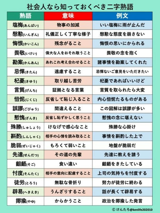 教養になる知識やクイズを毎朝図解で紹介してくれている、けんたろ| 知識図解さんの役立つ二字熟語の投稿が話題です。投稿はこちら。