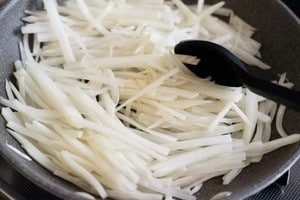 1. フライパンでごま油を熱し、皮をむいて細切りにした大根をさっと炒めます。
