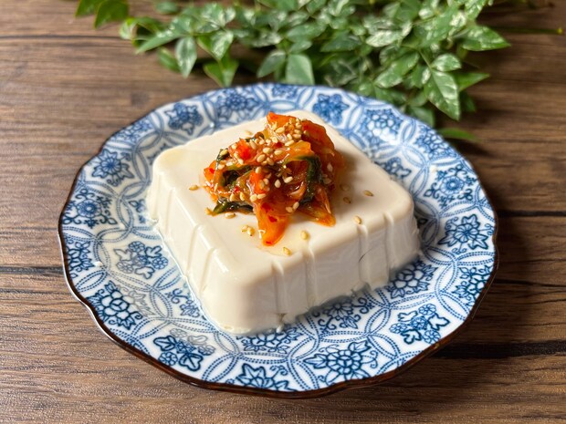 ピリッとパンチの効いた味付けが好きな方やおつまみにしたい方にぴったりのキムチ × ごまの韓国風温奴です。電子レンジで加熱した温奴に、キムチ大さじ1〜2杯を盛り付けてごま油をまわしかけます。