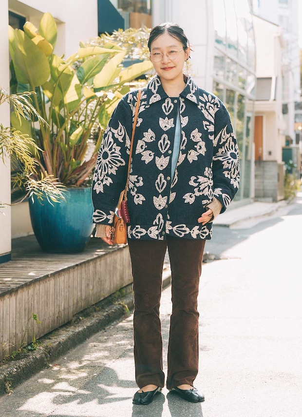 『メゾン マルジェラ』のタビシューズでモードな足元コーデ。ブラウンのボトムスと相性抜群で、大人の余裕を感じさせる冬の装い。