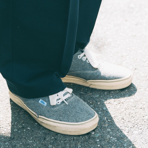足元はライトグレーのスニーカーに決めて、コーデを軽やかに仕上げ! キッズとさりげなく色をシェアして統一感を出したのも見逃せない。