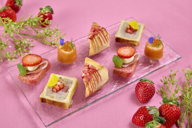 スタンド下段にて用意されるのは、シェフこだわりのセイボリー4種。「リエットサーモンのプチロール」や「ポークとマロンのパテ」のほか、いちごを取り入れた「いちごのスコーン」、「モッツァレラチーズの生ハム巻きといちごのカナッペ」も提供。