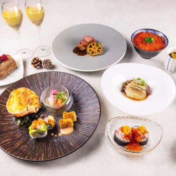 クリスマスには、シェフが腕によりをかけた特別なディナーコースが登場。ウニやいくら、和牛など豪華食材を使った全7皿が、ロマンティックな夜を華やかに彩る。