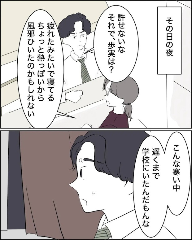 その日の夜、私は仕事から帰ってきた夫の博之に歩実が閉じ込められたことを話しました。「許せないな、それで歩実は?」と心配そうに問いかける博之。「疲れて寝てる、ちょっと熱っぽいから風邪ひいたのかも」私がそう言うと、「こんな寒い中、遅くまで学校にいたんだもんな」と辛そうな表情で窓の外を見つめました。