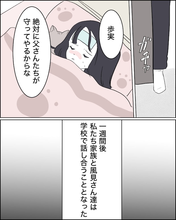 このとき私たちは、絶対に歩実を守ると固く誓いました。そして1週間後、私たち家族と風見さんたちは、いじめの件について学校で話し合うことになったのです。