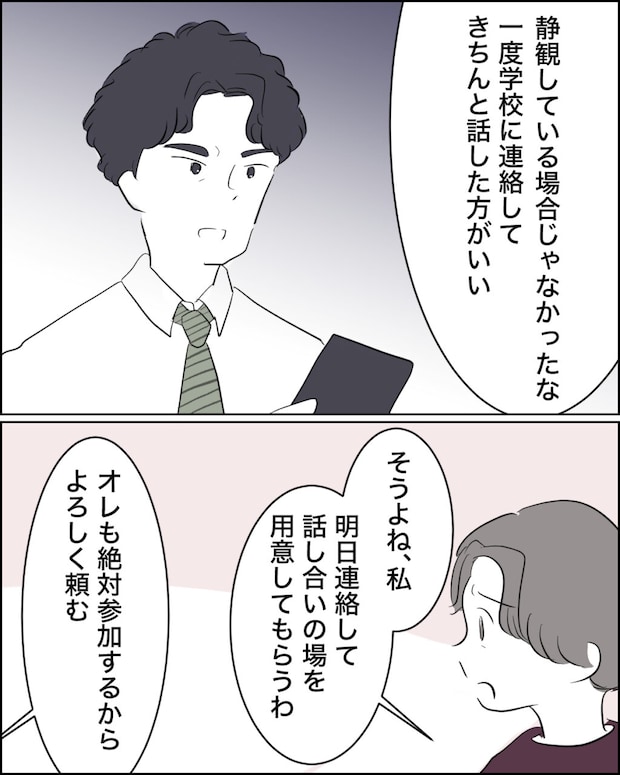 事態を放っておけないと思った博之はスマホを手に取り、「静観している場合じゃなかったな、一度学校に連絡してきちんと話した方がいい」と言いました。私もその言葉に頷き「明日連絡して話し合いの場を用意してもらうわ」と応えます。博之は落ち着いていましたが、表情から怒りに震えているのがわかりました。