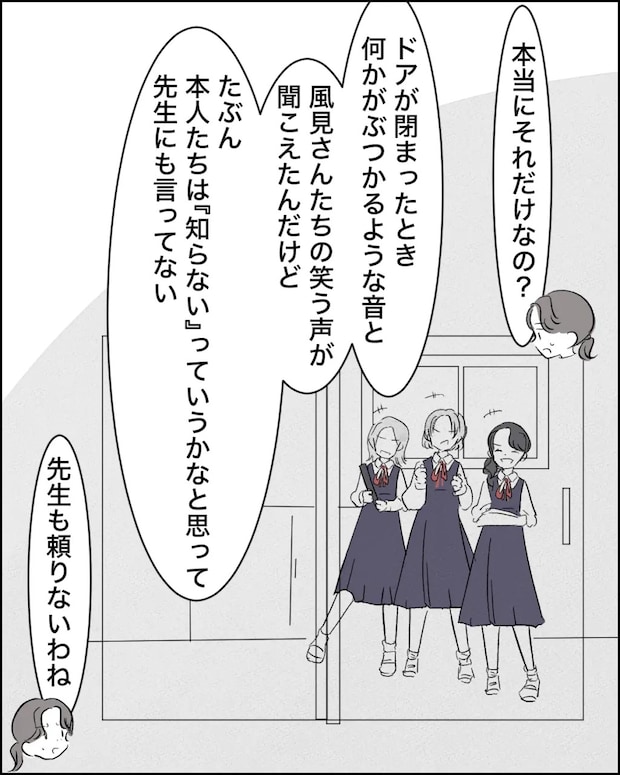 しかし、実際に歩実が閉じ込められたときには、何かがぶつかるような音と風見さんたちの笑い声が聞こえたそうです。「たぶん本人たちは知らないって言うかなと思って先生にも言ってない」と話す歩実。私は担任の先生の頼りなさに頭を抱えました。