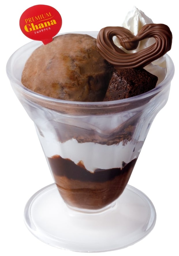 「プレミアムガーナアイス」を主役に、チョコ風味のフィアンティーヌやブラウニーを重ねた、チョコレート尽くしのパフェ。