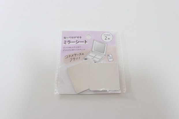 今回ご紹介するのは、その名も『貼ってはがせるミラーシート』。2枚入りでお値段は¥110(税込)とコスパ抜群。材質はアクリル樹脂とアルミニウム箔で、サイズは約縦40mm×横40mmです。