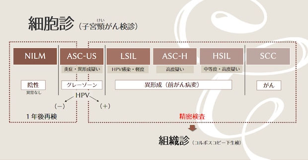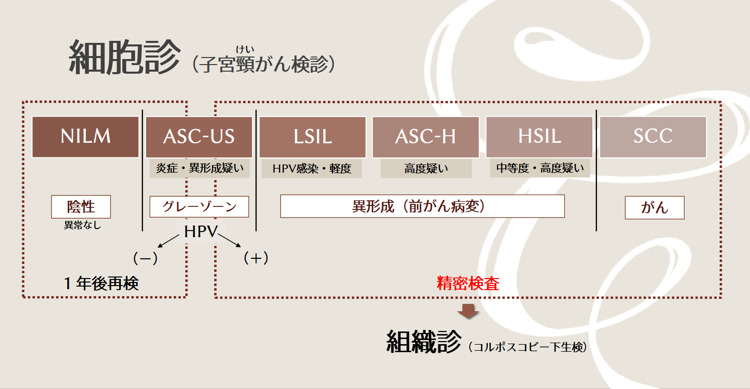 「ASC-US」は、グレーゾーンであり、HPV感染の有無と併せて判断されます。HPVが陰性であれば「NILM」と同じ扱いですが、陽性だった場合は精密検査(組織診)となります。医療機関によってはHPV感染の検査を行わず、6ヶ月後と12ヶ月後に細胞診を行うこともあります。ガイドライン上はどちらも間違いではありません。さらに「LSIL」「ASC-H」「HSIL」については、細胞の異形成・前がん病変が疑わしい場合に使われる表現で、こちらも精密検査(組織診)の対象となります。