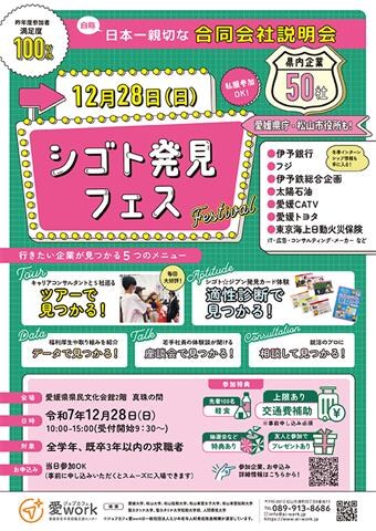 愛媛県内の企業50社が集結!「シゴト発見フェス」は、若手社員との座談会や適性診断など就活に役立つ企画が満載。愛媛県庁・松山市役所も参加し、地元での就職を考える学生必見の合同会社説明会です。