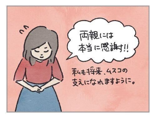 子どもが生まれ、私と子どもを全面的に支えてくれて、本当にありがとう。でも、子育ての大変さがわかった今では、「小さい頃の方が大変だった、感謝なんて今さら!」と思われるかもな、とも思います(笑)。私も将来、お父さんやお母さんのように、子どもの支えになれますように。