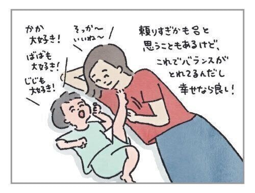親に頼れずにしっかりやっている方もいるので、私は頼りすぎかも・・・と思うこともあります。でも、子どもが「かか大好き!ばばも大好き!じじも大好き!」とニコニコ叫ぶのを聞くと、これでみんな幸せなんだからいっか、と思えます。高齢な親に頼るのは気が引けますが、我が家なりのバランスをこれからも保っていけたらいいなと思っています。