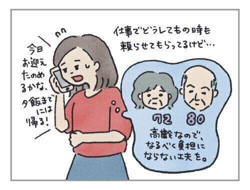 仕事でどうしてもの時も、頼らせてもらっています。会議が長引いて保育園のお迎えにいけないときや、日曜日に仕事があるときや、病気で保育園を休んでいるけど仕事があるときなど。でも親も高齢なので、あまり無理させると心配で・・・なるべく頻度も低く(月に2、3回でしょうか)、短時間にする工夫をしています。