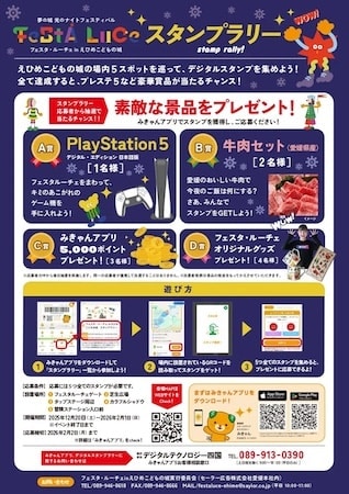 賞品として、PlayStation 5 デジタル・エディション 日本語版を1人、愛媛県産牛肉セットを2人、「みきゃんアプリ」5,000ポイントが3人、フェスタ・ルーチェ オリジナルグッズを4人分などをプレゼント。参加方法の詳細は「みきゃんアプリ」で確認しよう。