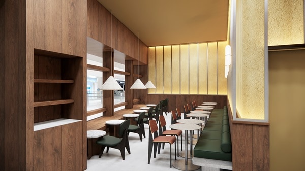 同氏は「純喫茶や旅館に通じる日本的な要素を手がかりに、焙煎の香りを思わせるブラウンの板張りで構成した木質空間が、周囲の白く明るい空間に対しネガとポジが反転する“いい違和感”となり、木陰に佇むような落ち着きをもたらす居場所となる。明るい施設内の中であえて“木陰”をつくる。その反転が、周囲とは異なる静度と存在感、そして珈琲を味わう豊かな時間のための奥行きを生み出します。(一部抜粋)」とコメントしている。