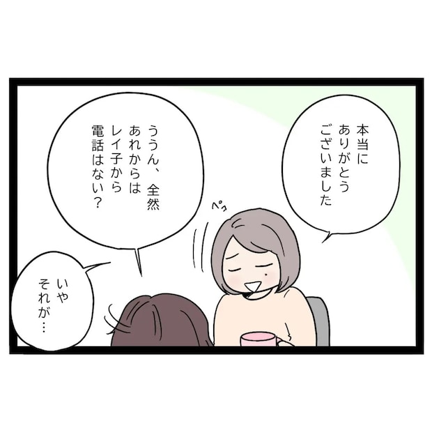 「本当にありがとうございました」深々と頭を下げるゆかちゃんに、私は「ううん全然、あれからはレイ子から電話はない?」と尋ねました。一度本性をさらした相手にまた連絡してくるほど図太くはないだろうと思いつつ、念のため確認します。すると、ゆかちゃんは「いや、それが・・・」と口を開きました。