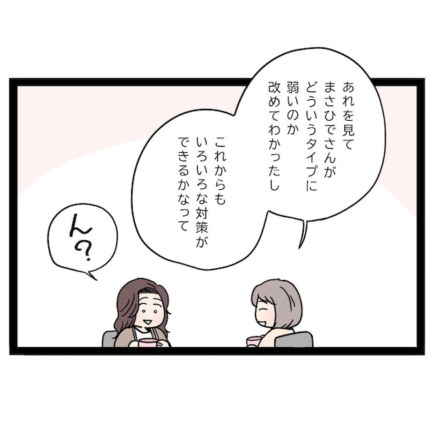 するとゆかちゃんはニッコリ笑って「あれを見て、まさひでさんがどういうタイプに弱いのか改めてわかったし、これからもいろいろな対策ができるかなって」と言いました。私はゆかちゃんが何を言っているのかすぐに理解できず、「ん?」と聞き返しました。