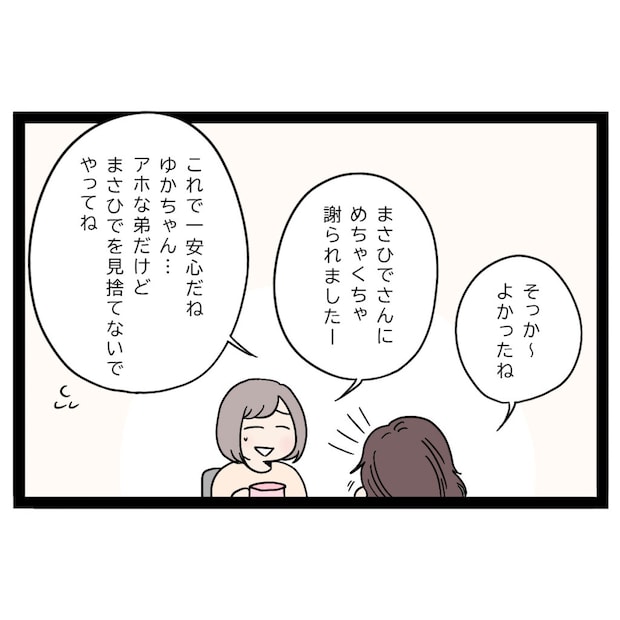 「そっか~よかったね」私は心の中で、まさひでやるじゃん!とガッツポーズ。これで正真正銘ひと安心です。「まさひでさんにめちゃくちゃ謝られました」と笑うゆかちゃんに、私は「アホな弟だけど、まさひでのこと見捨てないでやってね」とお願いしました。