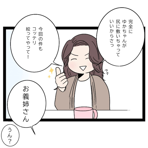 「完全にゆかちゃんが尻に敷いちゃっていいからさっ、今回の件もコッテリ絞ってやって!」そう言って親指を立てて笑っていると、ゆかちゃんが突然「お義姉さん」と私を呼びました。