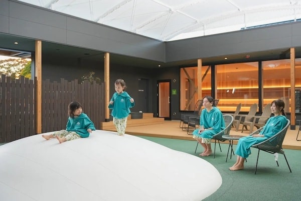 「サウナガーデン」は、男女共用のサウナを有した中庭空間。館内着で楽しめる大型サウナ室には、フィンランドHARVIA社製のサウナストーブを設置。毎日、熱波パフォーマンスやアウフグースを開催している。