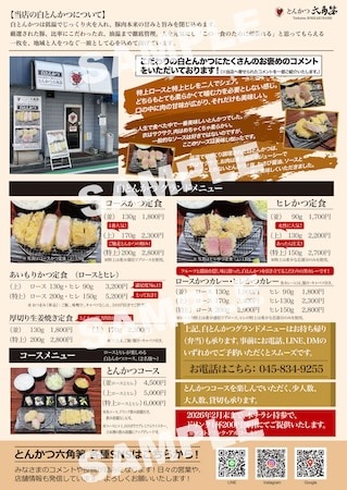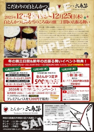 横浜白楽・六角橋の白とんかつ専門店「とんかつ六角箸(ろっかくはし)」は、12月23日(火)〜25日(木)の3日間と、2026年1月4日(日)〜11日(日)の期間、「お客様還元イベント」を開催する。