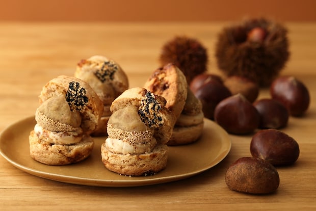 【関連写真】「BAKERS gonna BAKE」冬季限定スコーン、他イメージ4枚「『笠間の栗』の栗きんとんスコーンサンド」は、ほっくりと甘く香り豊かな笠間の栗ペーストで仕立てた栗きんとんを、イチジクの味わいと食感が楽しいクリームチーズと合わせ、黒糖スコーンでサンドした一品。香ばしいごまのチュイールがアクセント。価格は税込み460円。