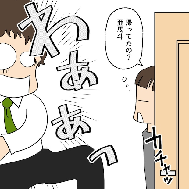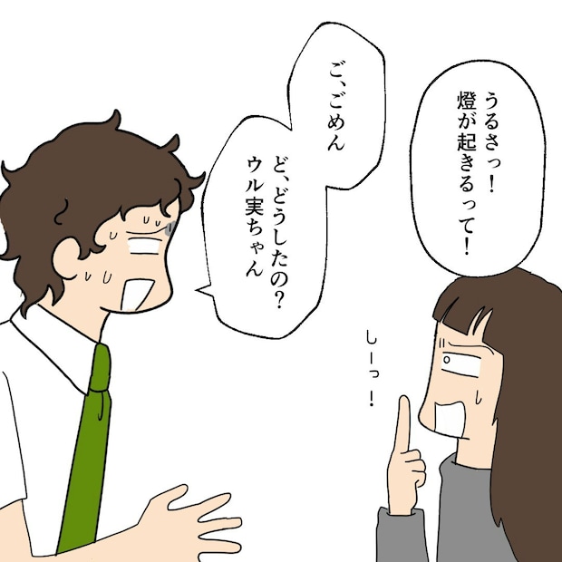 トイレに起きてきたウル実に対し、亜馬斗はやましい気持ちからか、挙動不審になっています。