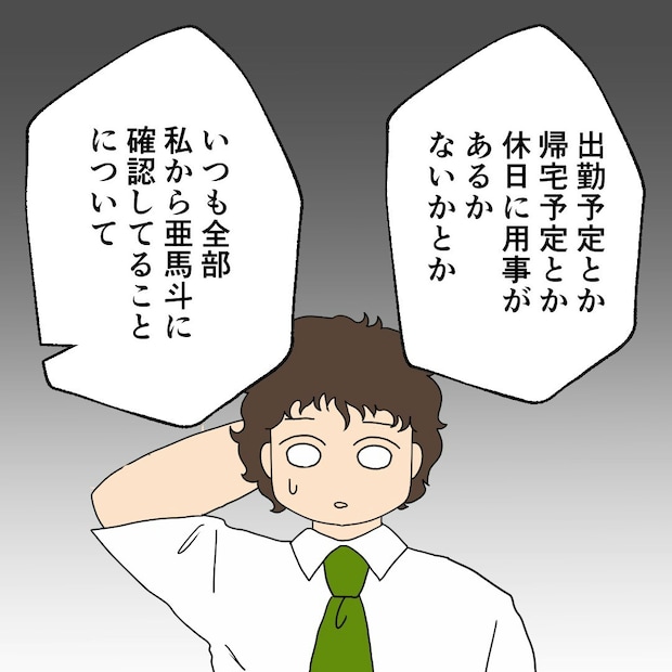 亜馬斗は、出勤や帰宅時間、休日の予定など、自分からは話しません。ウル実から聞かれたことにだけ、答えているようですね。