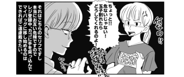 レジ作業中、かごに手を突っ込んでマイバッグに移す客。お互い危ないから絶対やめて…!/チェッカー鳥海さん、レジまでお願いします