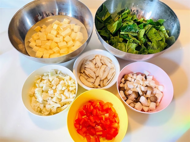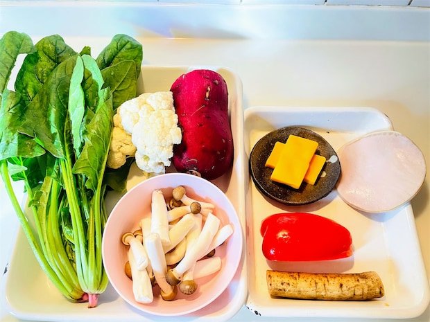 1. さつまいもは角切り、ごぼうは薄切りにして、それぞれを水に浸けてアクを抜く。ほうれん草は約2cmに切り、パプリカは角切りにする。