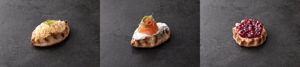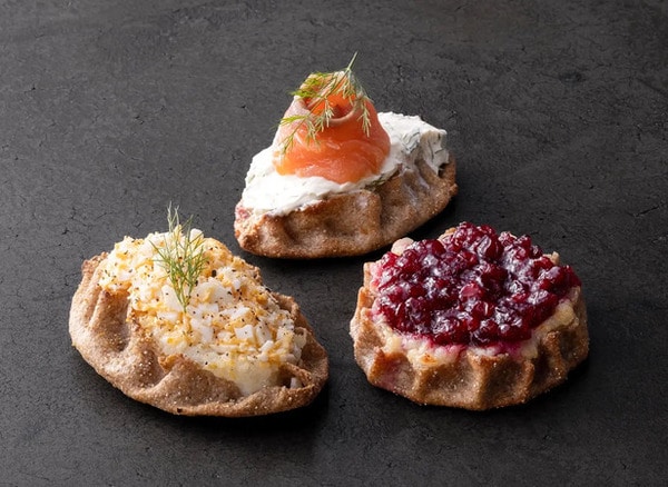(左から)カルヤランピーラッカ+ムナボイ/カルヤランピーラッカ+スモークサーモン/ペルナピーラッカ+リンゴンベリージャム ©Shinya Kigure