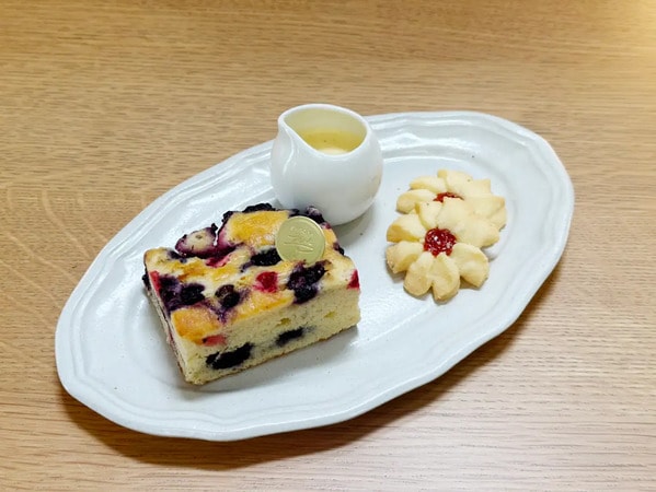 バニラクリームをとろりとかけて食べる、ブルーベリーとリンゴンベリーがいっぱいの、フィンランドの定番ケーキ「マルヤピーラッカ」650円もラインアップされている。